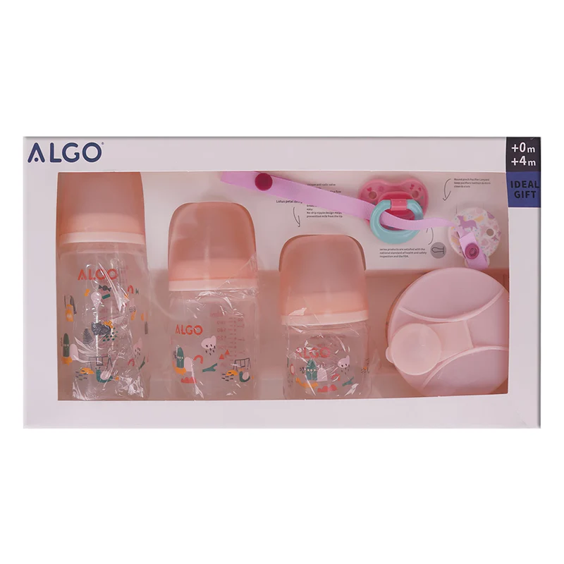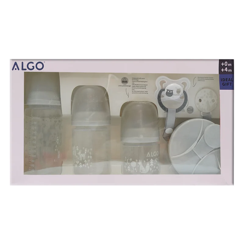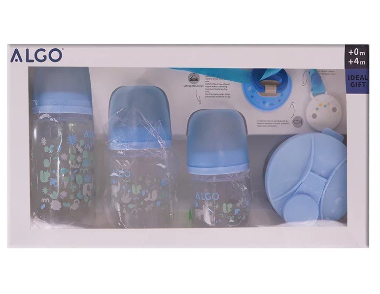 This Algo Baby Feeding Set is an ideal gift for newborns (0m+) and includes essential items. It contains a selection of bottles with natural, breast-shaped teats for comfortable, anti-colic feeding. The set also features a matching pacifier, clip, and powder dispenser for convenience. All components are coordinated in a soothing light blue color, perfect for baby’s first feedings. It comes in colours of blue, pink and ash.