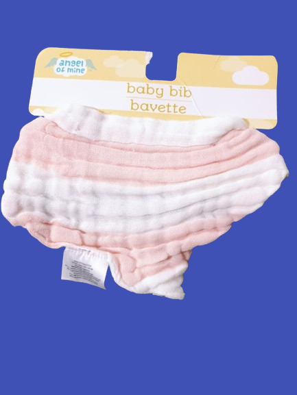 This soft Angel of Mine Baby Bib features gentle pink and white stripes. The bib uses a lightweight, breathable muslin or gauze fabric. This absorbent material easily catches drool and spills. The crinkled texture adds comfort and charm. Parents secure the bib easily around the baby’s neck. It is a perfect daily accessory for feeding and teething babies.