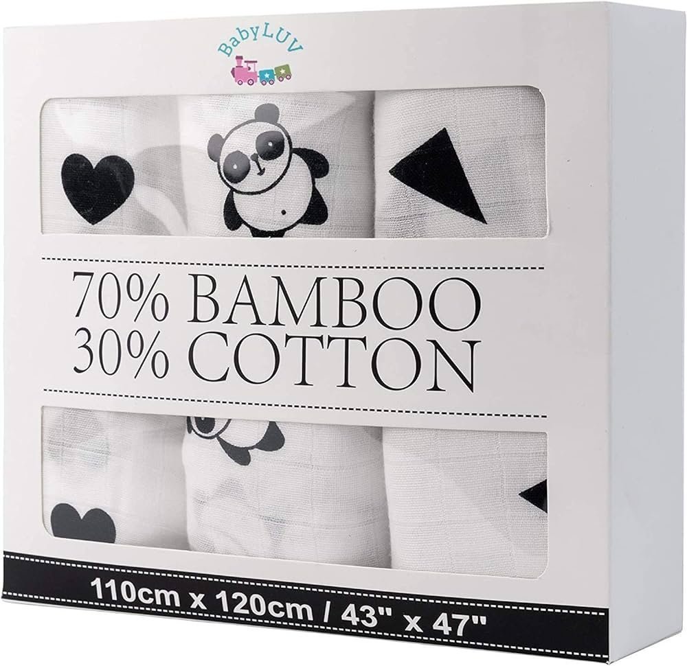 This premium swaddle set features three extra-large cloths measuring 110cm x 120cm (43″ x 47″). Made from a breathable blend of 70% bamboo and 30% cotton, offering superior softness and comfort. The black and white high-contrast prints include panda, heart, and geometric shapes, ideal for visual stimulation. Perfect for swaddling, burp cloths, nursing covers, or stroller blankets.