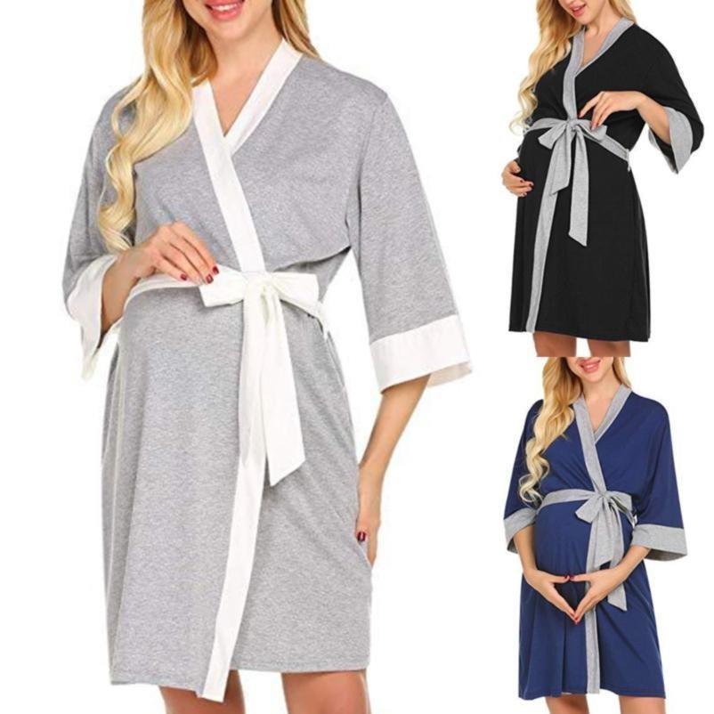 This comfortable robe is essential for pregnancy and postpartum wear. It is likely made from a soft, breathable cotton blend fabric. The robe provides easy coverage during your hospital stay. It is designed for simple, discreet nursing access. The tie-waist adjusts perfectly to your changing size. It features a stylish contrast trim design.