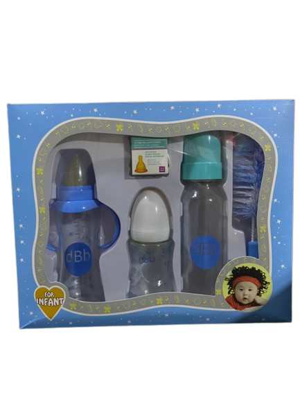 This comprehensive dBb feeding kit provides everything a new parent needs for infant bottle feeding. The set includes a large bottle, a smaller ergonomic bottle with handles, and an egg-shaped bottle, catering to different feeding needs. It also features a bottle brush for easy cleaning and an extra nipple insert for versatile use. Packaged beautifully, this set is an excellent gift for baby showers and is clearly marked “For Infant” use.