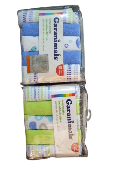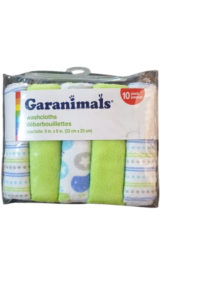This set provides 10 soft baby washcloths for daily use. Each washcloth measures 9 in. * 9 in. (23cm * 23 cm). They are made with soft, absorbent fabric for gentle cleaning. The packs come in coordinating colour schemes, like blue or green. This product is essential for bath time and clean-up tasks.