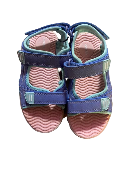 These stylish George sport sandals feature cool shades of blue and purple with vibrant pink accents for contrast. The design includes multiple adjustable hook-and-loop (Velcro) straps for a secure, custom fit that active kids can manage. A textured, pink footbed and flexible sole are built for comfort and durability during all-day play. Perfect for outdoor adventures, these durable sandals offer excellent support and a fun, sporty look.
