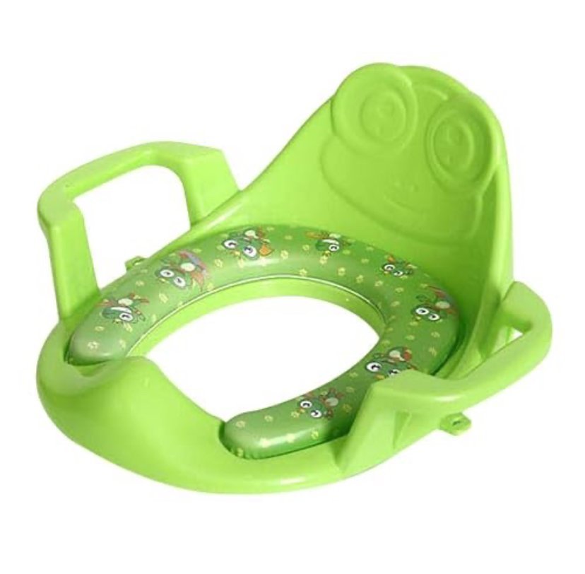 This fun training seat features a charming green frog design with eyes and integrated handles for stability. It includes a soft, comfortable padded insert with a cheerful frog pattern for superior comfort during training. The seat is designed to fit securely onto most standard adult toilet seats, promoting an easier transition for toddlers. Encourage independence and make potty time engaging with this sturdy and appealing training aid.