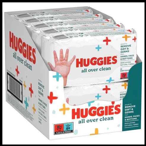 This pack contains 56 Huggies All Over Clean Baby Cleansing Wipes made with skin-loving natural fibers. Proven to effectively remove dirt and germs from hands, face, and bottoms. The strong yet soft wipes are designed for quick, convenient, and gentle cleaning anywhere. An essential staple for daily hygiene, offering reliable cleanliness for your little one.