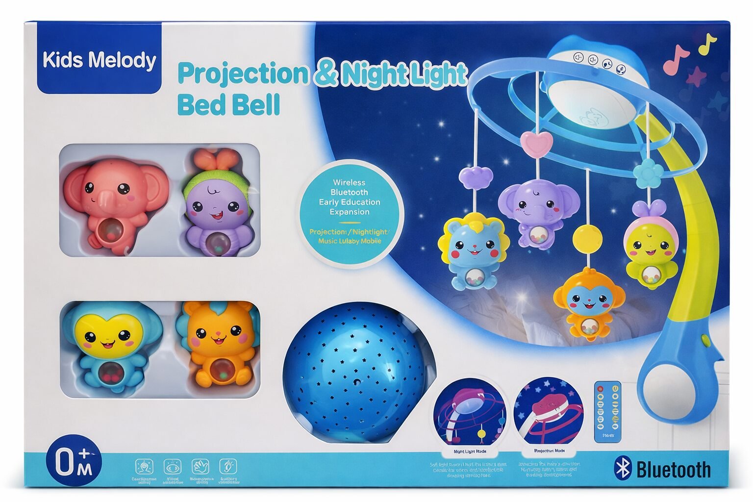 The Kids Melody Projection & Night Light Bed Bell transforms any crib into a cozy, musical sleep zone. The Kids Melody Projection & Night Light Bed Bell pairs gentle projection, soft light, and playful mobiles to calm babies. It offers Bluetooth audio, a starry projector, and colorful hanging characters. Parents can play lullabies or soothing sounds without extra devices. The mobile spins slowly, capturing attention without overstimulation. Its projector casts soft blue patterns on the ceiling, creating a night sky effect that helps infants settle.