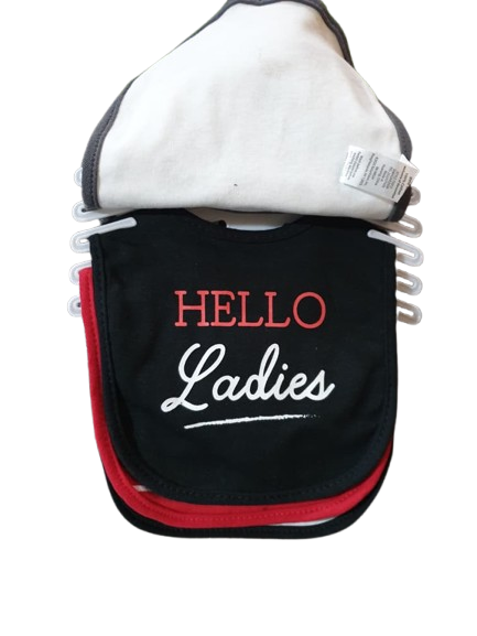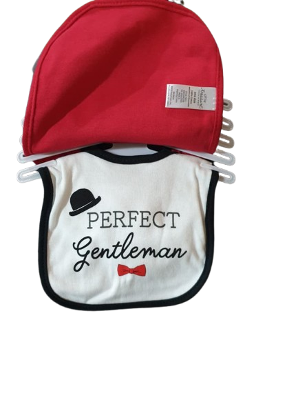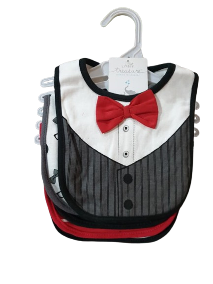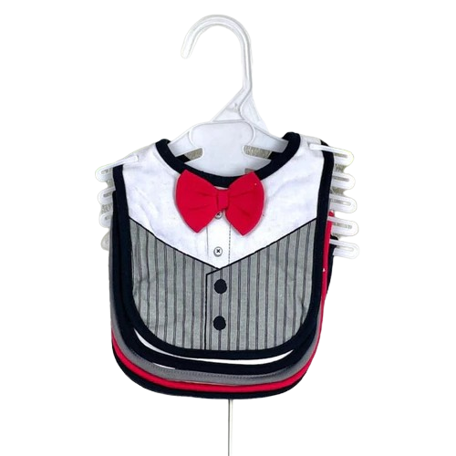 This stylish set includes five unique baby bibs. One bib features an adorable tuxedo print with a red bow tie. These bibs provide excellent protection against drool and spills. The set includes multiple coordinating patterns. They are made from soft, absorbent material for comfort.