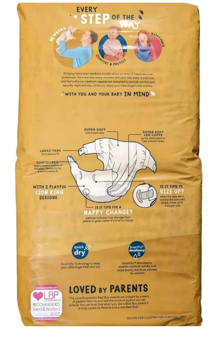 This Jumbo Pack of Little Angels by ASDA Newborn Nappies contains 60 wonderfully soft and breathable diapers. These Size 2 nappies are suitable for babies weighing 4-8kg (9-18lbs) and feature the Quick Dry SmartFit absorbency. They are Dermatologically Accredited and display two adorable Disney Baby The Lion King designs. Voted best buy and recommended by lovedbyparents, this is a trusted choice for your bundle of joy.