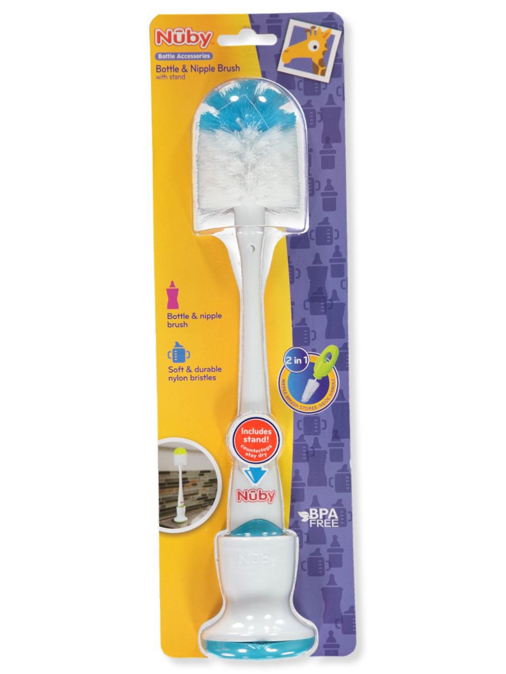 This essential 2-in-1 bottle and nipple cleaning brush features soft, durable nylon bristles for effective, scratch-free cleaning of all baby accessories. The smaller nipple brush is conveniently stored within the handle for easy access. It includes a suction cup base that doubles as a stand, allowing for hygienic storage and fast drying, and the entire product is BPA-Free, making it safe for babies 0 months and up.