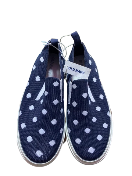 These comfortable Old Navy slip-on sneakers feature a classic navy blue knit with white polka dots. The stretch elastic sides and red pull-tab ensure they are incredibly easy for kids to slide on and off independently. With a durable white rubber sole, these lightweight shoes are perfect for playtime and everyday adventures. A versatile and stylish option that adds a fun, classic pattern to your child’s casual footwear collection.