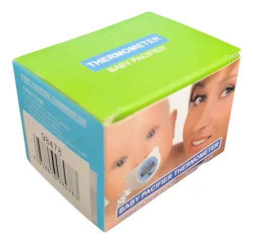Baby pacifier thermometer is shaped like a pacifier and has a protective storage cover.